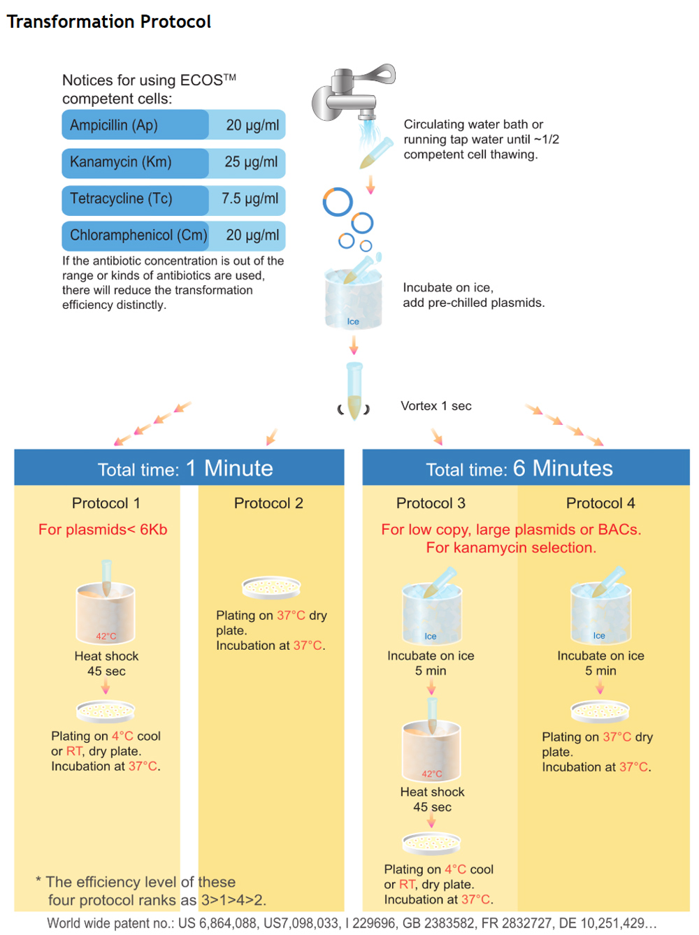 Yeastern Biotech Co., Ltd. owns the patent of ECOS™ technology (protocol) exclusively in USA, UK, Taiwan, and France (Patent No. US 6,864,088; GB 2383582; I 229696; FR 2832727, etc.). Under the protection of this patent, Yeastern Biotech is the only company that has the right to use the protocol with the claims that transformation with our ECOS™ chemically competent cells can be finished within one minute and SOC is not needed. If anyone intends to sell competent cells that use ECOS™ protocol or its similar version, please contact our headquarters in Taiwan for licensing.